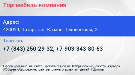 Торгмебель, компания по адресу 420054, Татарстан, Казань, Техническая, 2 в дальнейшем Организация, размещена в следующих категориях: