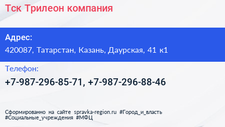 Тск Трилеон, компания по адресу 420087, Татарстан, Казань, Даурская, 41 к1 в дальнейшем Организация, размещена в следующих категориях: