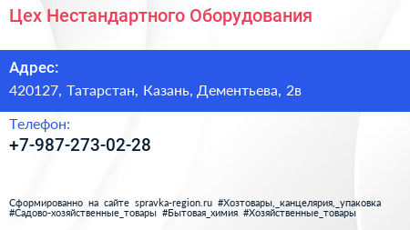 Цех Нестандартного Оборудования по адресу 420127, Татарстан, Казань, Дементьева, 2в в дальнейшем Организация, размещена в следующих категориях: