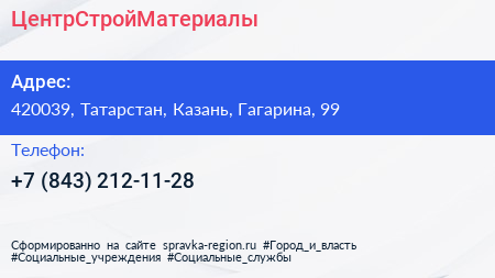 ЦентрСтройМатериалы по адресу 420039, Татарстан, Казань, Гагарина, 99 в дальнейшем Организация, размещена в следующих категориях: