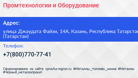 Промтехнологии и Оборудование по адресу улица Джаудата Файзи, 14А, Казань, Республика Татарстан (Татарстан) в дальнейшем Организация, размещена в следующих категориях:
