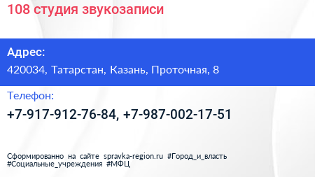 108, студия звукозаписи по адресу 420034, Татарстан, Казань, Проточная, 8 в дальнейшем Организация, размещена в следующих категориях:
