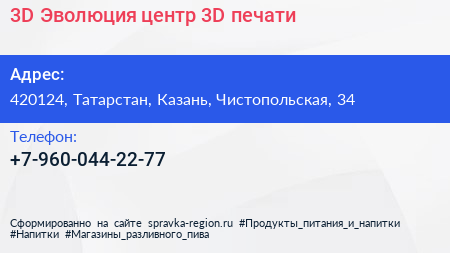 3D Эволюция, центр 3D-печати по адресу 420124, Татарстан, Казань, Чистопольская, 34 в дальнейшем Организация, размещена в следующих категориях: