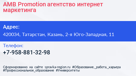 AMB-Promotion, агентство интернет-маркетинга по адресу 420034, Татарстан, Казань, 2-я Юго-Западная, 11 в дальнейшем Организация, размещена в следующих категориях: