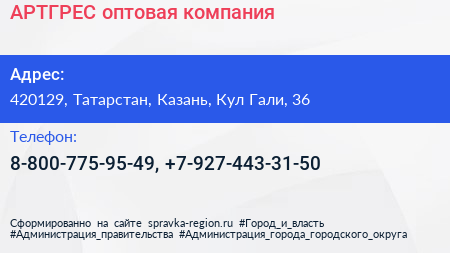 АРТГРЕС, оптовая компания по адресу 420129, Татарстан, Казань, Кул Гали, 36 в дальнейшем Организация, размещена в следующих категориях: