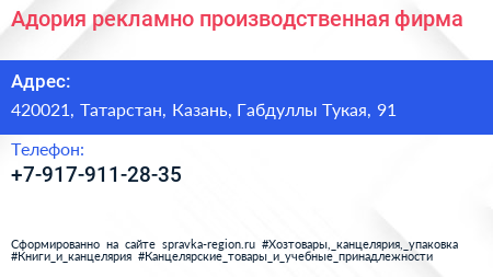 Адория, рекламно-производственная фирма по адресу 420021, Татарстан, Казань, Габдуллы Тукая, 91 в дальнейшем Организация, размещена в следующих категориях: