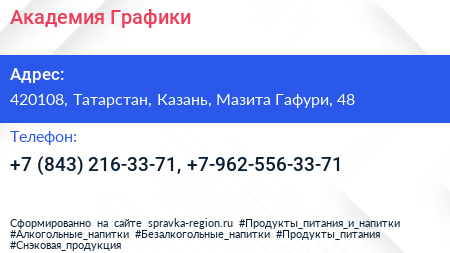 Академия Графики по адресу 420108, Татарстан, Казань, Мазита Гафури, 48 в дальнейшем Организация, размещена в следующих категориях: