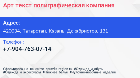 Арт-текст, полиграфическая компания по адресу 420034, Татарстан, Казань, Декабристов, 131 в дальнейшем Организация, размещена в следующих категориях:
