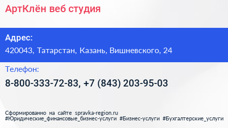 AртКлён, веб-студия по адресу 420043, Татарстан, Казань, Вишневского, 24 в дальнейшем Организация, размещена в следующих категориях: