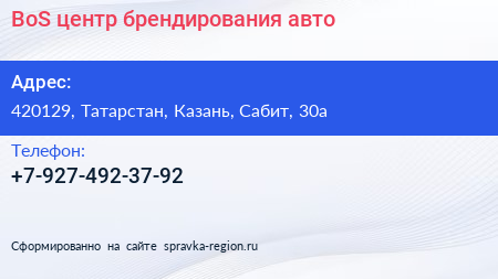 BoS, центр брендирования авто по адресу 420129, Татарстан, Казань, Сабит, 30а в дальнейшем Организация, размещена в следующих категориях: