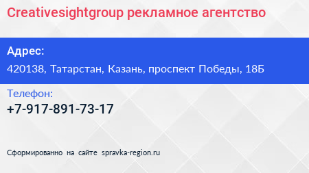 Creativesightgroup, рекламное агентство по адресу 420138, Татарстан, Казань, проспект Победы, 18Б в дальнейшем Организация, размещена в следующих категориях: