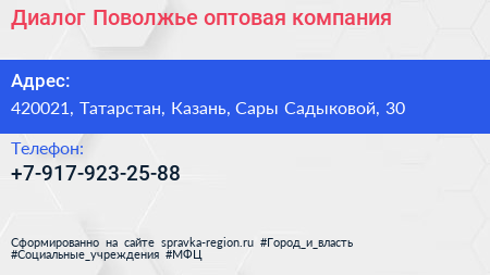 Диалог Поволжье, оптовая компания по адресу 420021, Татарстан, Казань, Сары Садыковой, 30 в дальнейшем Организация, размещена в следующих категориях: