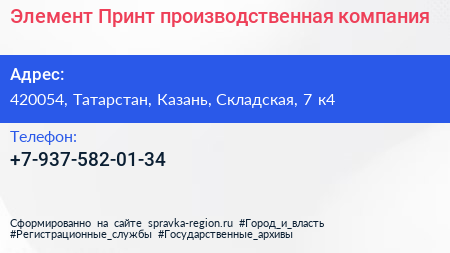 Элемент-Принт, производственная компания по адресу 420054, Татарстан, Казань, Складская, 7 к4 в дальнейшем Организация, размещена в следующих категориях:
