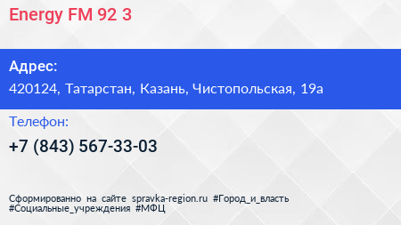 Energy, FM 92.3 по адресу 420124, Татарстан, Казань, Чистопольская, 19а в дальнейшем Организация, размещена в следующих категориях: