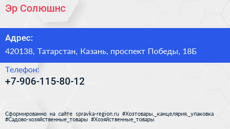 Эр-Солюшнс по адресу 420138, Татарстан, Казань, проспект Победы, 18Б в дальнейшем Организация, размещена в следующих категориях: