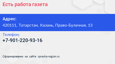 Есть работа, газета по адресу 420111, Татарстан, Казань, Право-Булачная, 13 в дальнейшем Организация, размещена в следующих категориях: