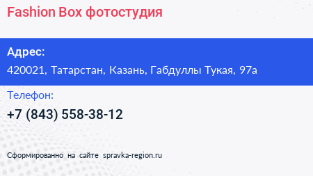 Fashion Box, фотостудия по адресу 420021, Татарстан, Казань, Габдуллы Тукая, 97а в дальнейшем Организация, размещена в следующих категориях: