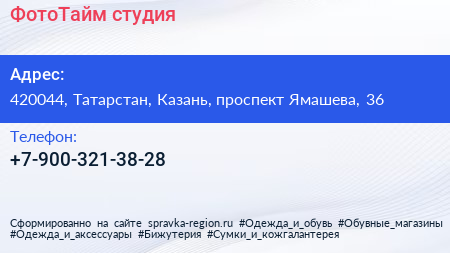 ФотоТайм, студия по адресу 420044, Татарстан, Казань, проспект Ямашева, 36 в дальнейшем Организация, размещена в следующих категориях: