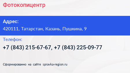 Фотокопицентр по адресу 420111, Татарстан, Казань, Пушкина, 9 в дальнейшем Организация, размещена в следующих категориях: