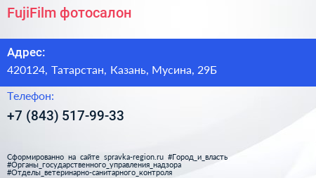 FujiFilm, фотосалон по адресу 420124, Татарстан, Казань, Мусина, 29Б в дальнейшем Организация, размещена в следующих категориях: