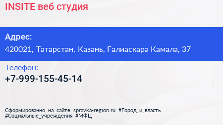 INSITE, веб-студия по адресу 420021, Татарстан, Казань, Галиаскара Камала, 37 в дальнейшем Организация, размещена в следующих категориях: