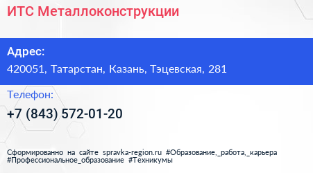 ИТС Металлоконструкции по адресу 420051, Татарстан, Казань, Тэцевская, 281 в дальнейшем Организация, размещена в следующих категориях: