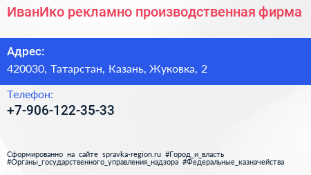 ИванИко, рекламно-производственная фирма по адресу 420030, Татарстан, Казань, Жуковка, 2 в дальнейшем Организация, размещена в следующих категориях:
