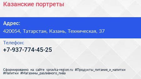 Казанские портреты по адресу 420054, Татарстан, Казань, Техническая, 37 в дальнейшем Организация, размещена в следующих категориях: