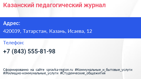 Казанский педагогический журнал по адресу 420039, Татарстан, Казань, Исаева, 12 в дальнейшем Организация, размещена в следующих категориях: