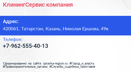 КлинингСервис, компания по адресу 420061, Татарстан, Казань, Николая Ершова, 49в в дальнейшем Организация, размещена в следующих категориях:
