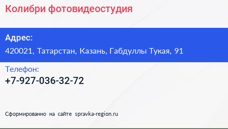 Колибри, фотовидеостудия по адресу 420021, Татарстан, Казань, Габдуллы Тукая, 91 в дальнейшем Организация, размещена в следующих категориях: