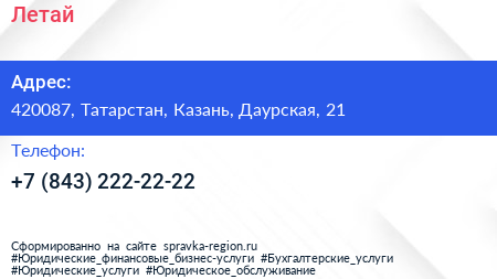 Летай по адресу 420087, Татарстан, Казань, Даурская, 21 в дальнейшем Организация, размещена в следующих категориях: