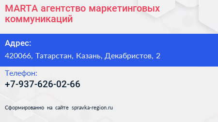 MARTA, агентство маркетинговых коммуникаций по адресу 420066, Татарстан, Казань, Декабристов, 2 в дальнейшем Организация, размещена в следующих категориях: