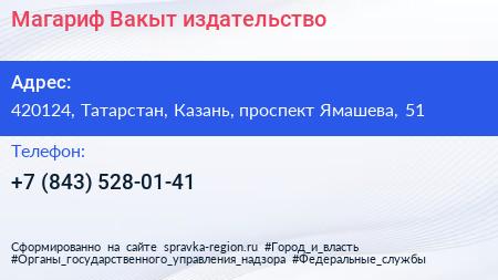 Магариф-Вакыт, издательство по адресу 420124, Татарстан, Казань, проспект Ямашева, 51 в дальнейшем Организация, размещена в следующих категориях: