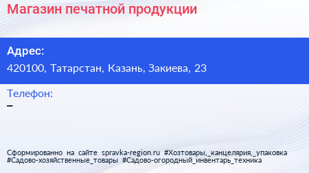 Магазин печатной продукции по адресу 420100, Татарстан, Казань, Закиева, 23 в дальнейшем Организация, размещена в следующих категориях: