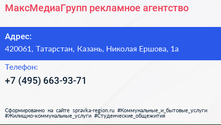 МаксМедиаГрупп, рекламное агентство по адресу 420061, Татарстан, Казань, Николая Ершова, 1а в дальнейшем Организация, размещена в следующих категориях: