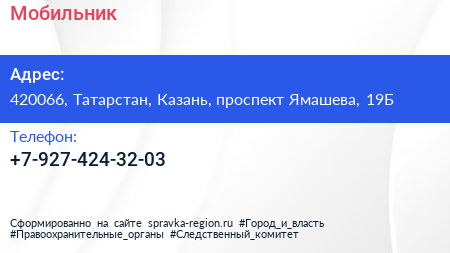 Мобильник по адресу 420066, Татарстан, Казань, проспект Ямашева, 19Б в дальнейшем Организация, размещена в следующих категориях: