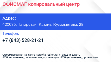 ОФИСМАГ, копировальный центр по адресу 420095, Татарстан, Казань, Кулахметова, 28 в дальнейшем Организация, размещена в следующих категориях: