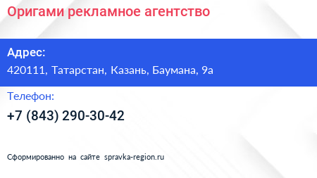 Оригами, рекламное агентство по адресу 420111, Татарстан, Казань, Баумана, 9а в дальнейшем Организация, размещена в следующих категориях: