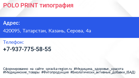 POLO PRINT, типография по адресу 420095, Татарстан, Казань, Серова, 4а в дальнейшем Организация, размещена в следующих категориях: