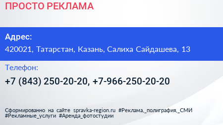 ПРОСТО РЕКЛАМА по адресу 420021, Татарстан, Казань, Салиха Сайдашева, 13 в дальнейшем Организация, размещена в следующих категориях: