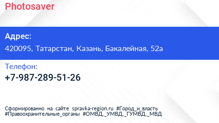 Photosaver по адресу 420095, Татарстан, Казань, Бакалейная, 52а в дальнейшем Организация, размещена в следующих категориях: