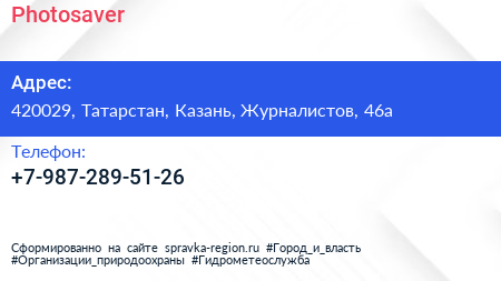 Photosaver по адресу 420029, Татарстан, Казань, Журналистов, 46а в дальнейшем Организация, размещена в следующих категориях: