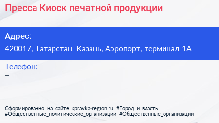 Пресса, Киоск печатной продукции по адресу 420017, Татарстан, Казань, Аэропорт, терминал 1А в дальнейшем Организация, размещена в следующих категориях: