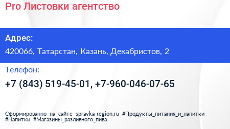 Pro Листовки, агентство по адресу 420066, Татарстан, Казань, Декабристов, 2 в дальнейшем Организация, размещена в следующих категориях: