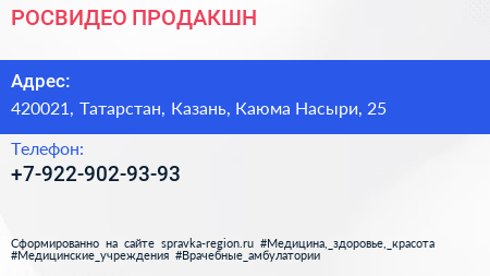 РОСВИДЕО ПРОДАКШН по адресу 420021, Татарстан, Казань, Каюма Насыри, 25 в дальнейшем Организация, размещена в следующих категориях: