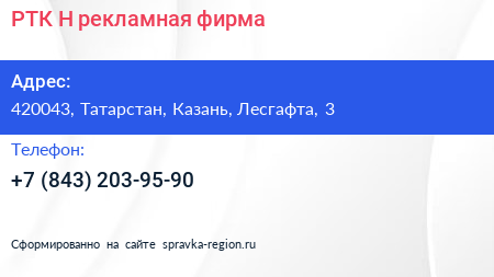 РТК-Н, рекламная фирма по адресу 420043, Татарстан, Казань, Лесгафта, 3 в дальнейшем Организация, размещена в следующих категориях: