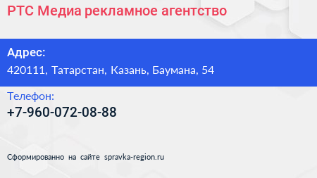 РТС-Медиа, рекламное агентство по адресу 420111, Татарстан, Казань, Баумана, 54 в дальнейшем Организация, размещена в следующих категориях: