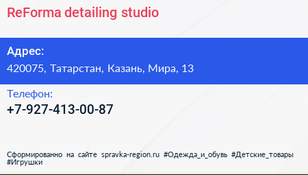 ReForma detailing studio по адресу 420075, Татарстан, Казань, Мира, 13 в дальнейшем Организация, размещена в следующих категориях: