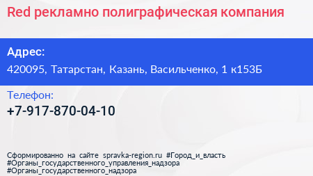 Red, рекламно-полиграфическая компания по адресу 420095, Татарстан, Казань, Васильченко, 1 к153Б в дальнейшем Организация, размещена в следующих категориях:
